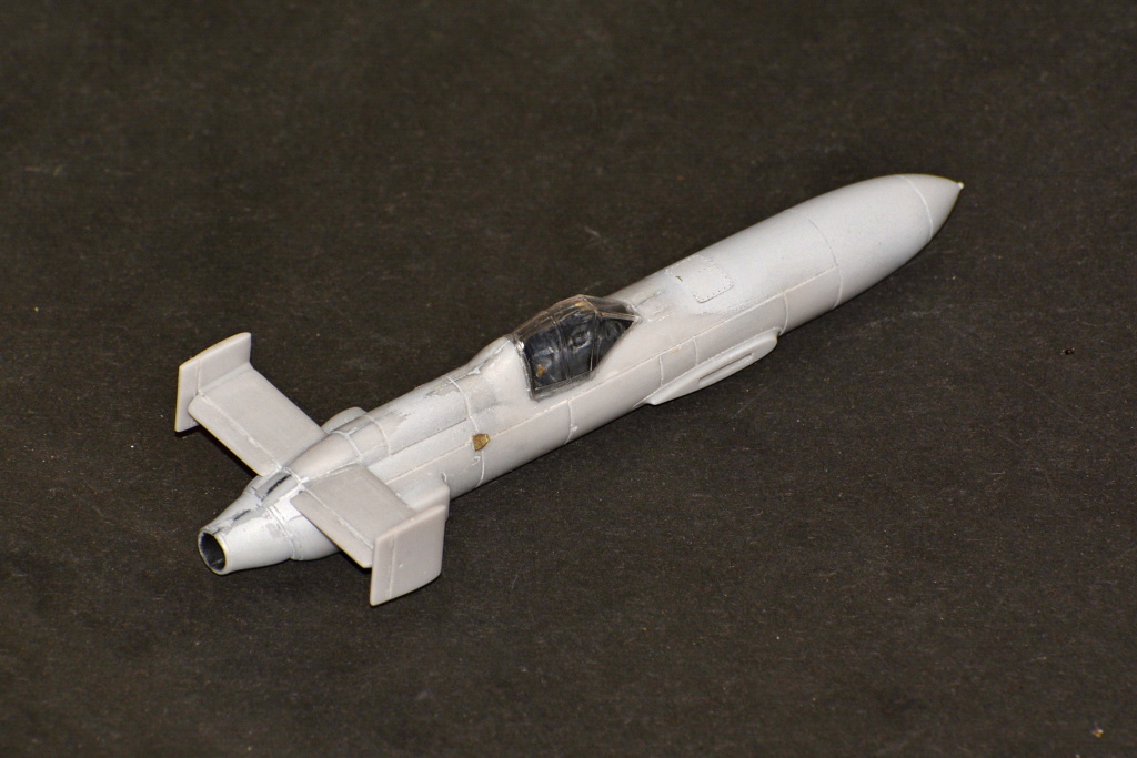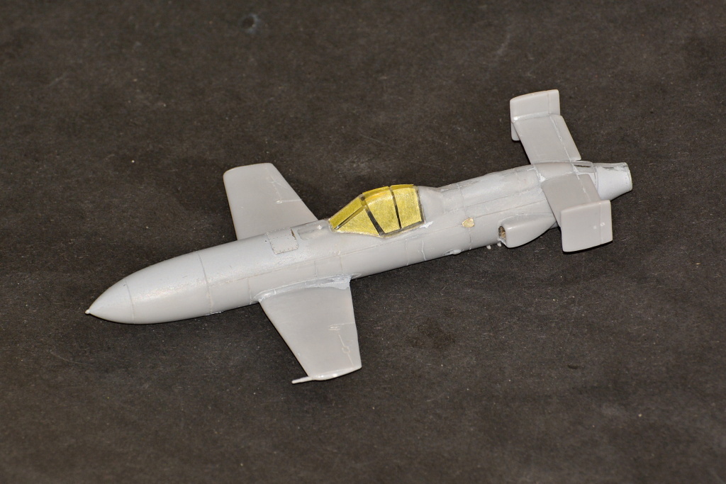 Kabinku jsem zamaskoval pomocí masek BRL72165. Sedí slušně a jelikož má překryt rámování poměrně mělké, velice usnadní práci než kdybychom maskoval kabinku svépomocí. Bohužel na vršku překrytu se jim později moc nechtělo přilehnout a odchlipovaly se. Napojení křídel na trup nebylo zrovna ideální, tentokrát opět přišel na řadu tmel. Hrubou stavbu jsem zakončil přilepením venturiho trubice a výfuků startéru.