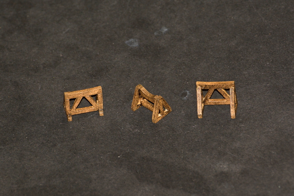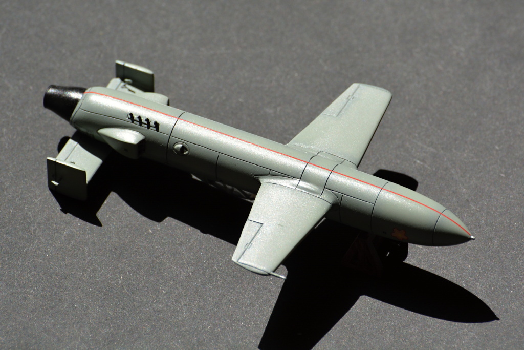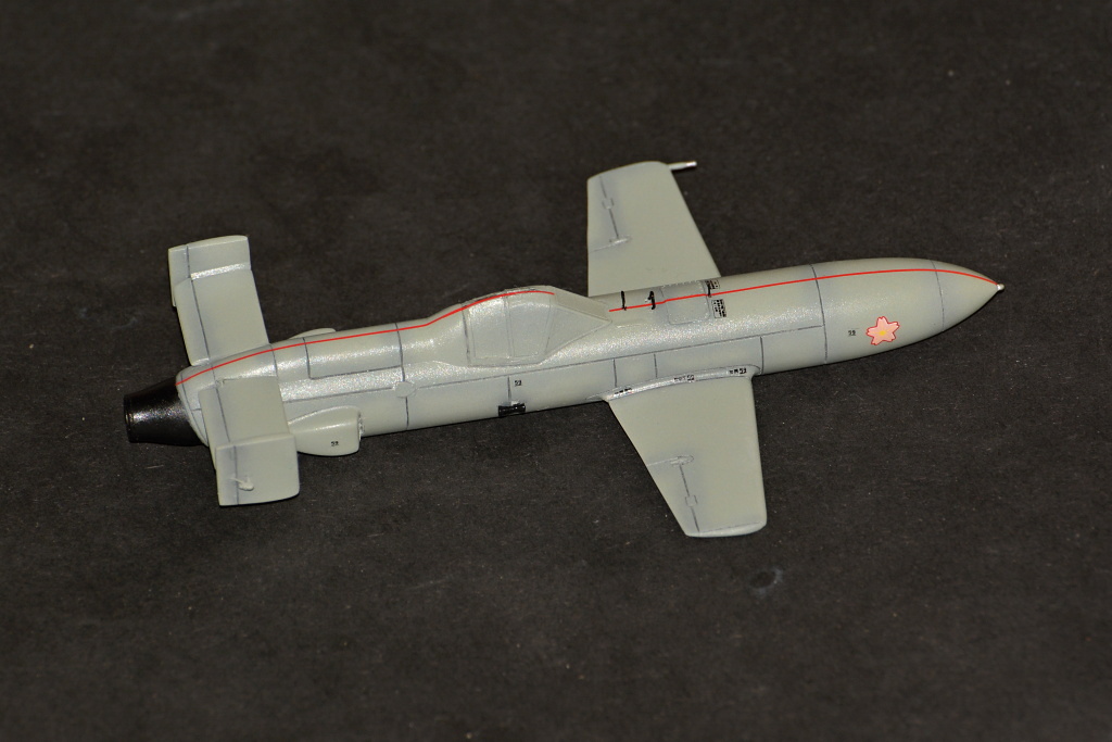 Barvení jsem zahájil trochu netradičně ještě před celkovým nastříkáním surfaceru. Nejprve jsem černou barvou nabarvil výtokovou trysku a následně zamaskoval. Teprve nyní jsem byl trochu jistější a přilepil další exteriérové lepty, a sice vyvážení na VOP a SOP. Po celkovém surfu a vychytání drobností na povrchu následoval preshading. Celý letounek pak dostal šedé zbarvení, odstín tamiya XF12 J.N. Grey. Byť návod udává černé pouze trysku a výfuky startéru, dle fotky muzejního kusu jsem černou udělal i venturiho trubici. Dřevěné podstavce, na kterých má letoun stát, jsem nabarvil dřevem od agamy a zašmrdlal černou olejovkou. Po zalakování sidoluxem byl model připraven na obtisky.