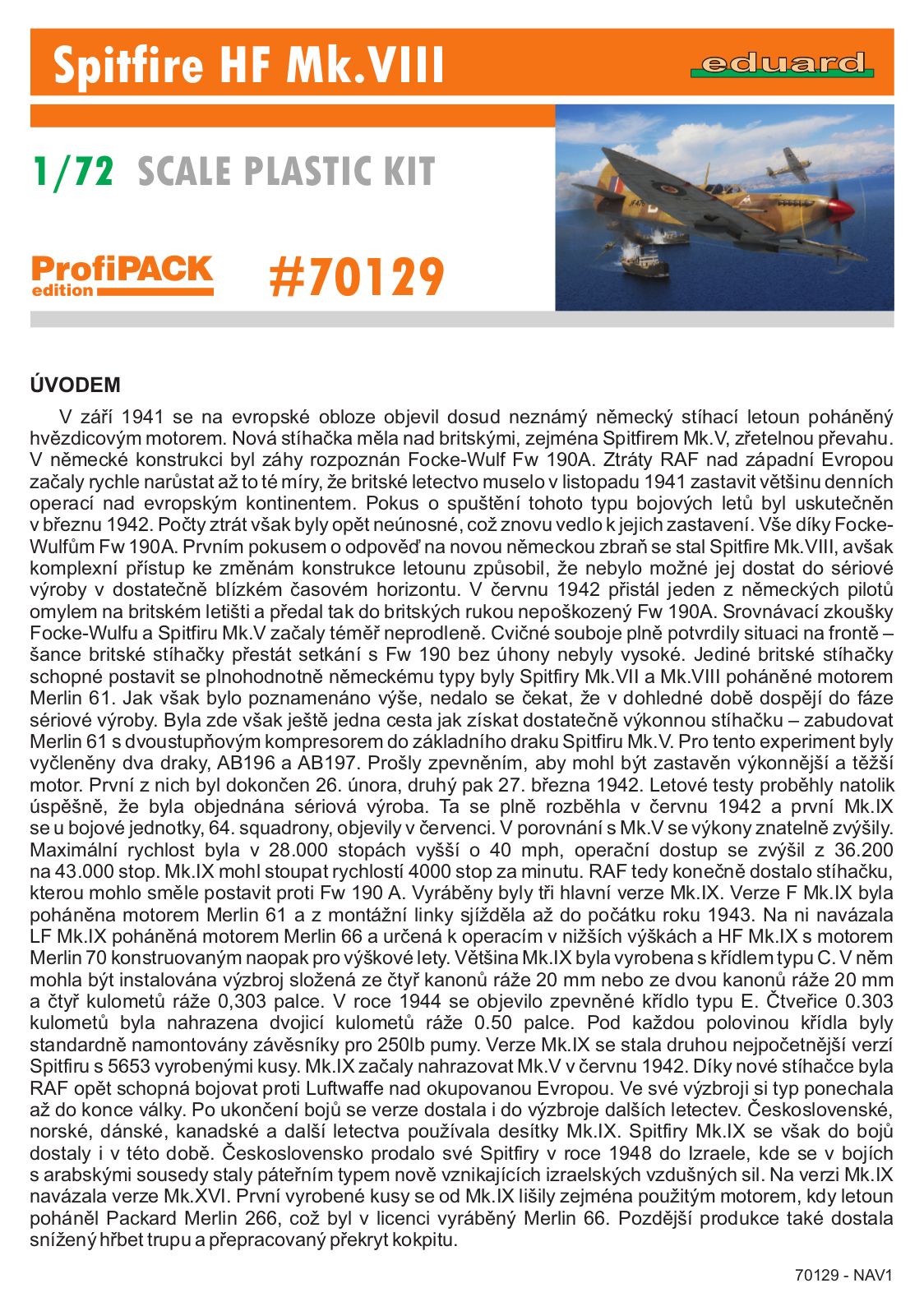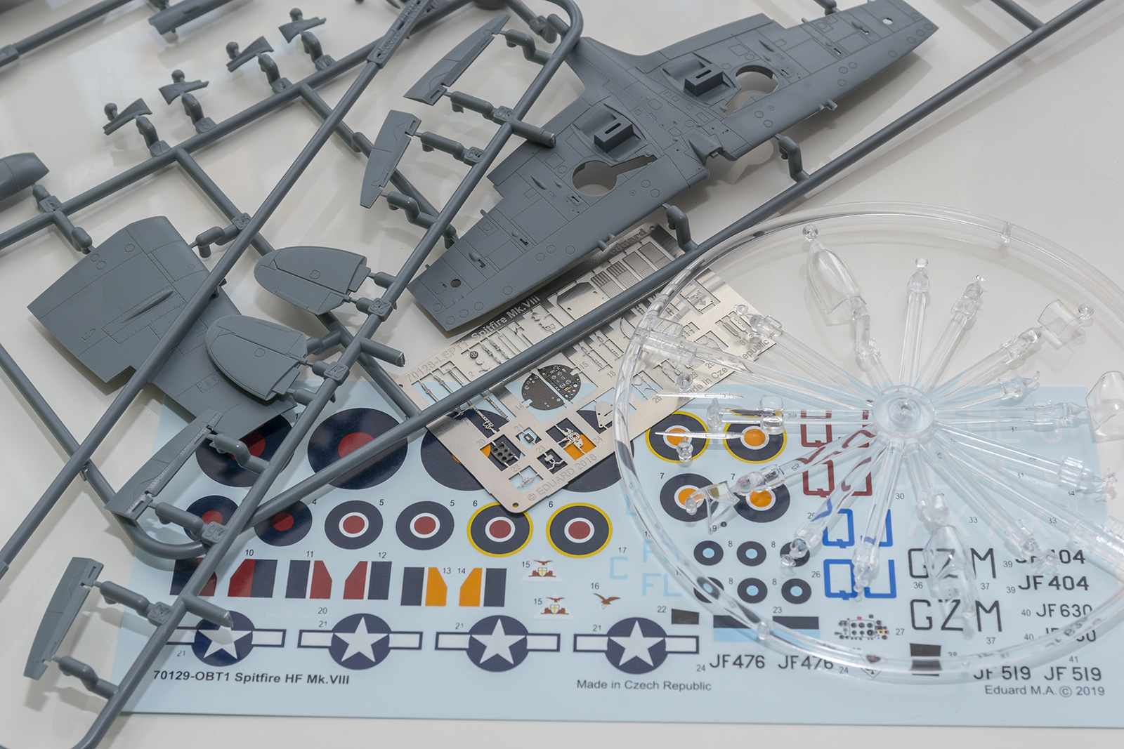 "Osmiček" již Eduard pár vydal - Weekend edition i Profipack. Teď představíme výškový stroj, tedy s příznakem HF v edici Profipack - tedy s lepty a maskami. Spitfire HF Mk.VIII byl upraven pro dosažení vysokých výkonů ve velké nadmořské výšce.