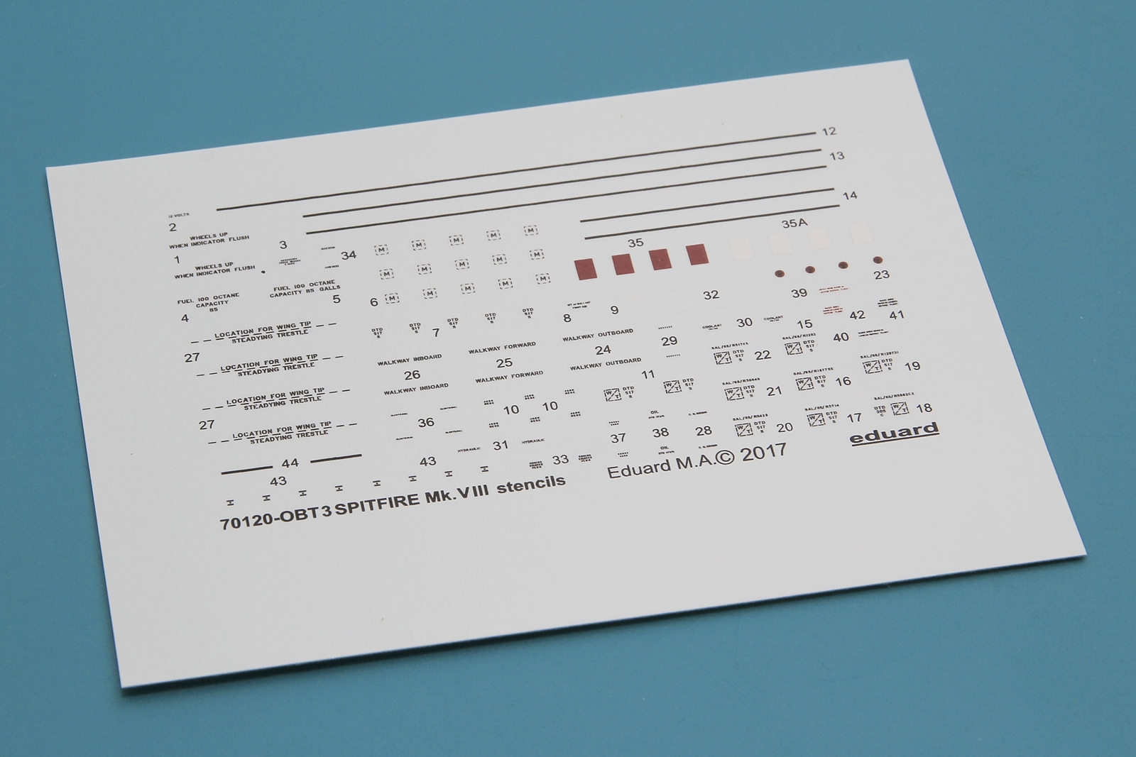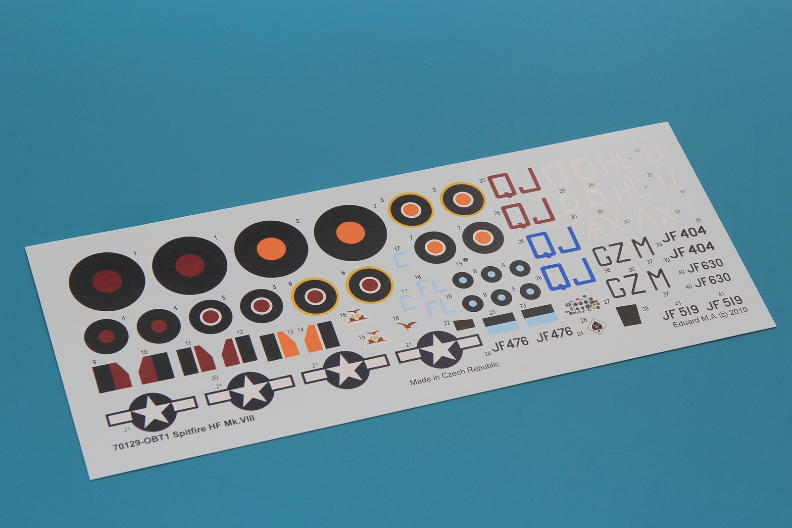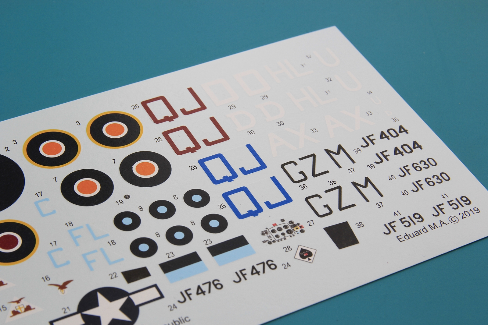 Pro tuto stavebnici si Eduard obtisky vyrobil sám. Obtisky od Eduardu nejsou vůbec špatné co se týče práce s nimi, ale kryvost světlých barev není tak kvalitní jako u jiných výrobců. Nicméně soutisk, detailnost a ostrost je parádní. V obtiscích naleznete i přístrojovou desku, tedy pro případ, že nevyužijete leptané díly.