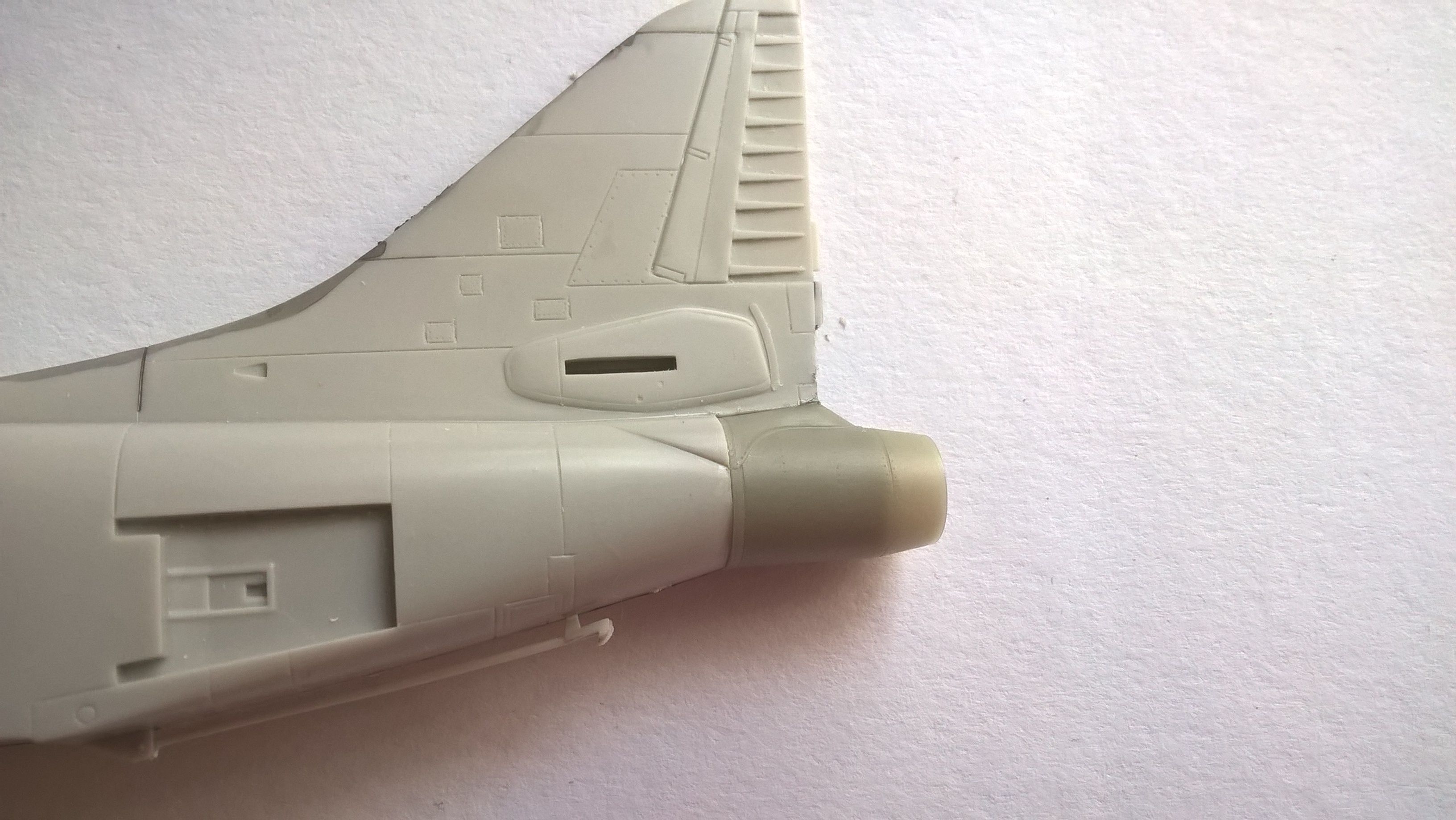 Po postupném přikládání a ubírání stěn trupu a lehkého obroušení venkovních trysky trysku konečně zasunul do trupu. A další komplikace, plech na trysce má oproti modelu i originálu menší rozměry a jeho zvětšení nebude jednoduchou záležitostí. Navíc délka trysky nám částečně brání ke správnému úhlu instalace.