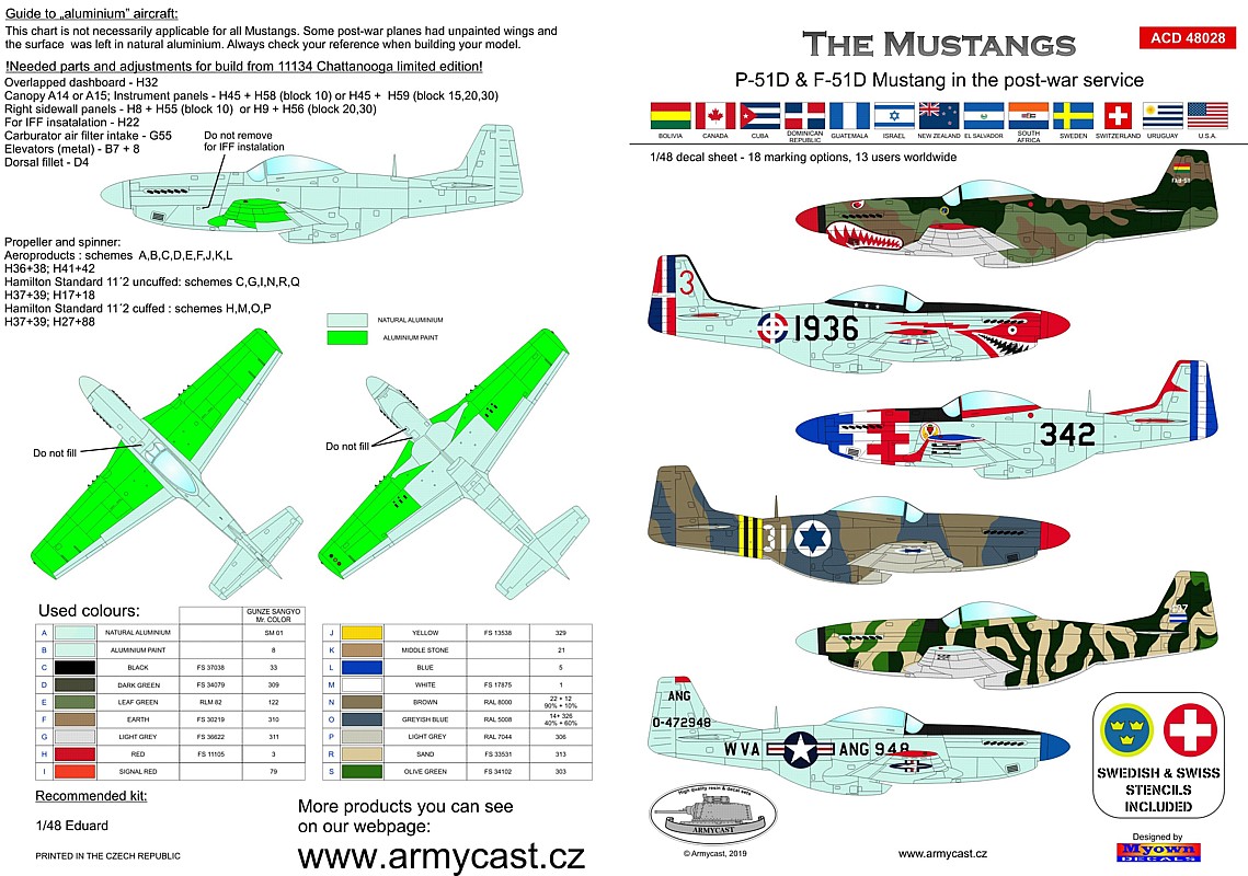 Nový Mustang od Eduardu zatiaľ vyšiel v dvoch prebaloch so zaujímavými kamuflážami. Všetky sú ale vojnové a tak pre všetkých ktorý by mali záujem o povojnovú exotiku, pripravil Armycast kokteil 18 zaujímavých markingov.