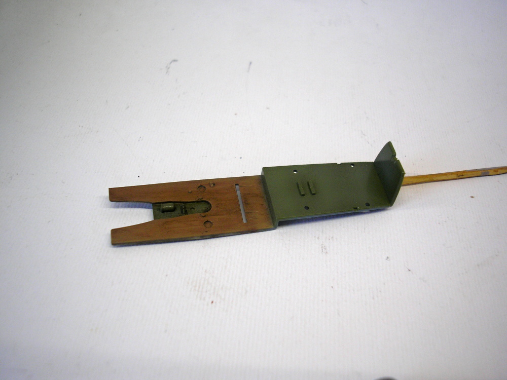 Po sestavení křídla jsem se začal věnovat trupu. Z rámečku jsem vyjmul podlahu kokpitu a tu začal barvit. Letouny měli v pilotním prostoru podlahu ze dřeva pokrytou protiskluzovým nátěrem, který byl na některých místech prodřený. Takže jsem podlahu nastříkal barvou dřeva, olejovkou naznačil léta a po zafixování sidoluxem nastříkal dark washem od Miga. Na daných místech jsem pak párátkem naznačil zmiňované prodření.