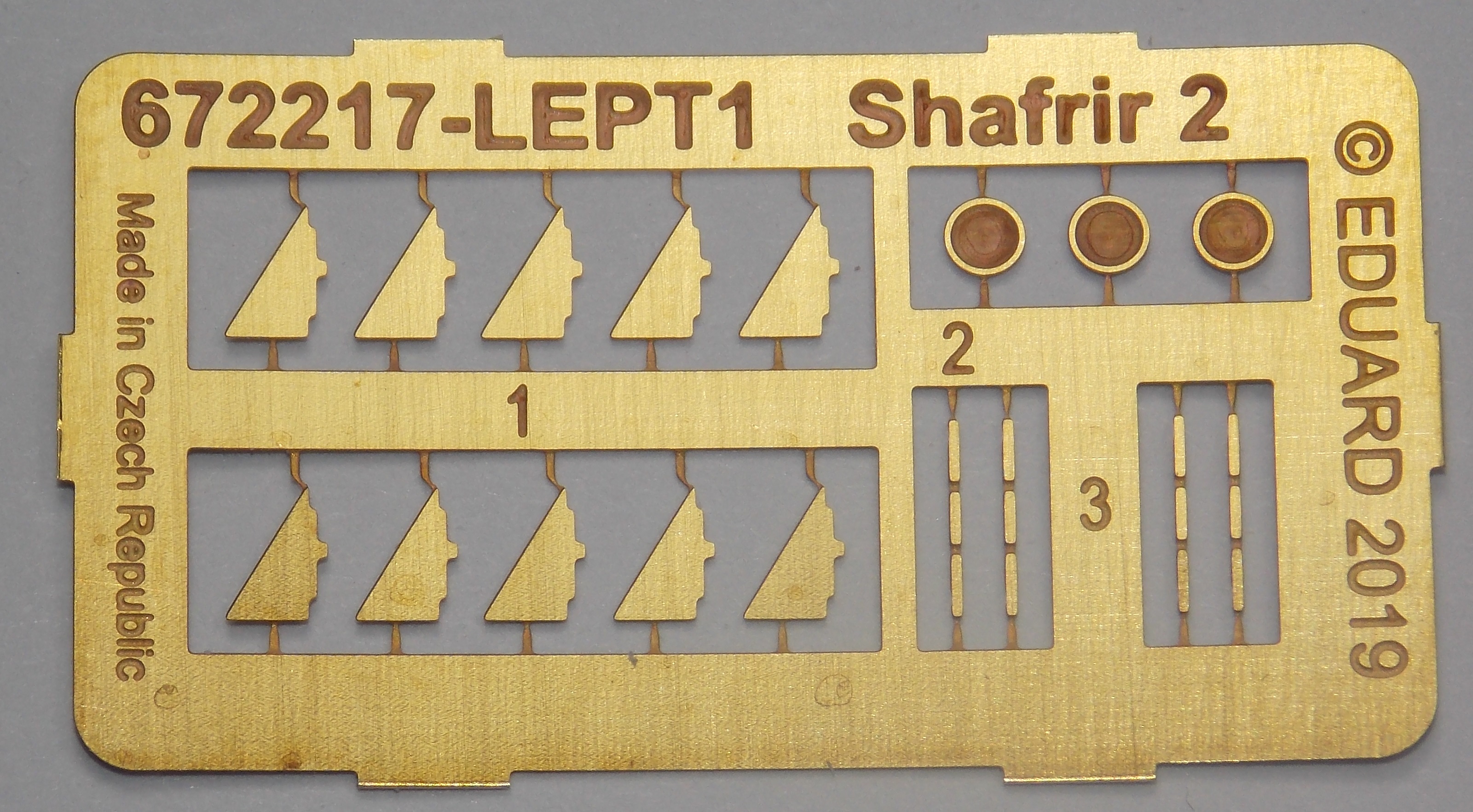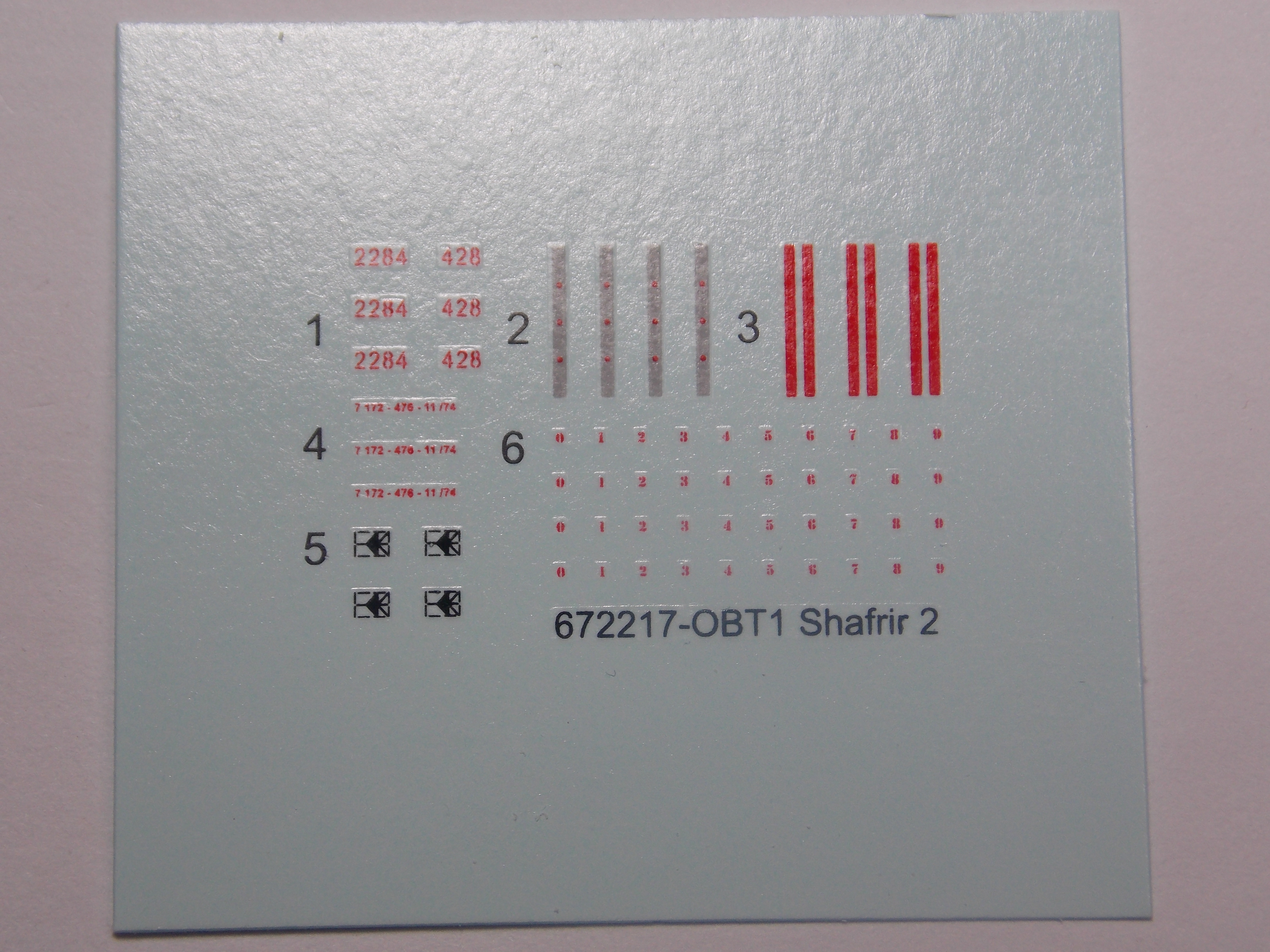 Na fotkách strojů s Shafriry-2 je vidět, že každá raketa měla pravděpodobně svoje číslo. Zde tedy nezbude než si patřičný obtisk nechat vyrobit nebo sám vytisknout. Ještě je možnost neřešit a užít si instalaci. Mnoho podkladů, modelářova smrt.