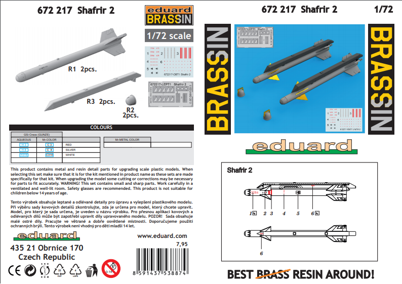 V balení nalezneme rakety, závěsníky a kryty hlavice. Resinové odlitky lze firmě Eduard jen pochválit. Krásně odlito bez sebemenší chyby. Radost se koukat na takové produkty.