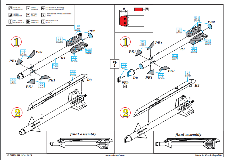 Návod nám nabízí dvě varianty instalace na model. První je klasická tzv. ostrá verze, se kterou létají letouny na mise. Druhá variantu jsem nazval přepravní. To znamená, že hlavice je přikrytá krytem, který se sundává těsně před letem. Aby modelář mohl použít tuto variantu, čeká jej odříznutí bojové hlavice a nalepení příslušného PUR a kovového dílu. Vše návod krásně ukazuje.