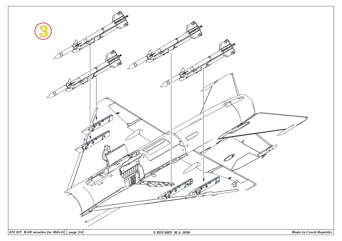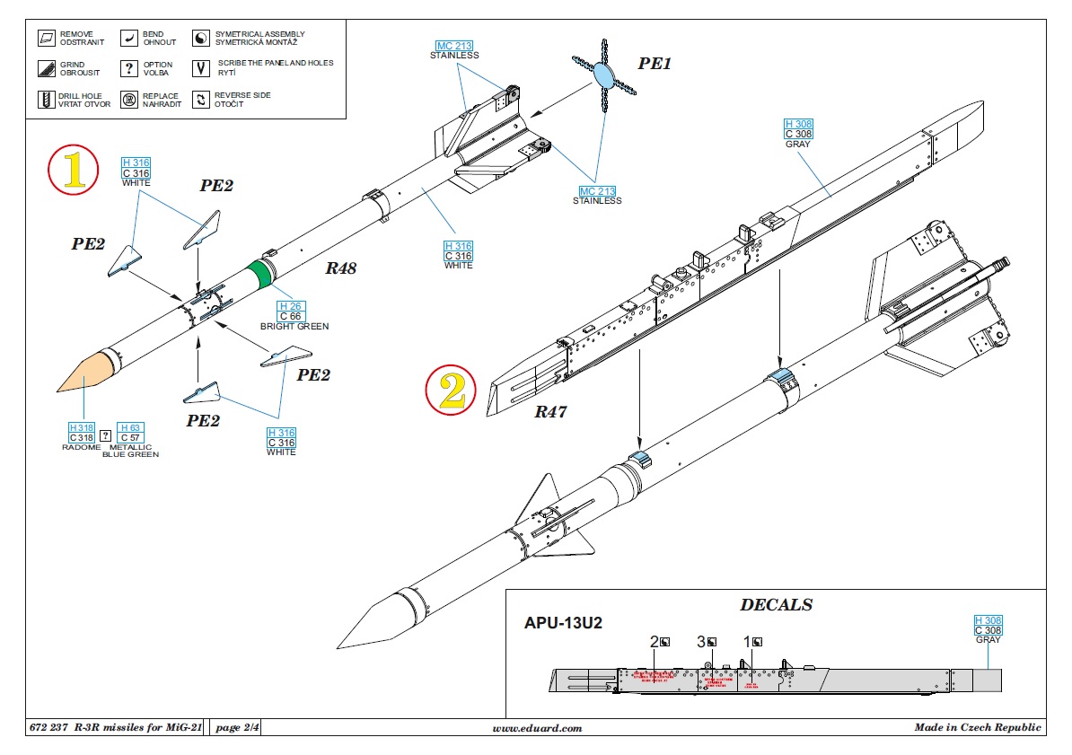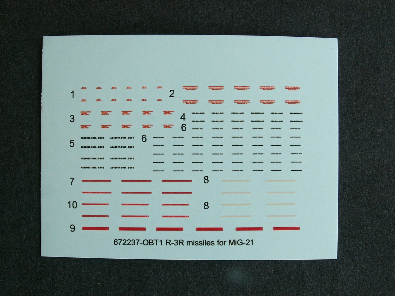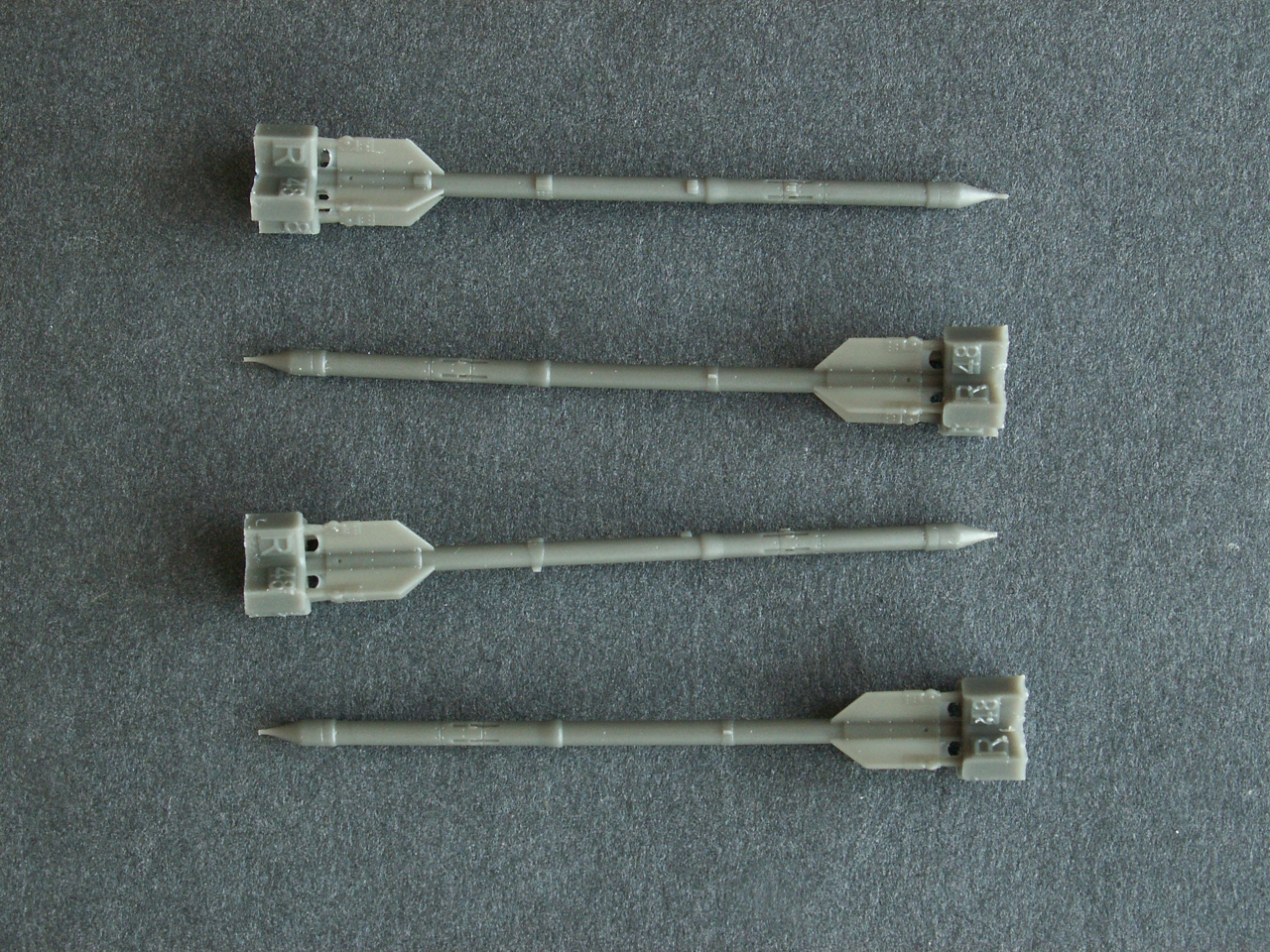 Každou ze čtyř raket sestavíme ze základního těla, čtyř leptaných křidélek a odpalovací ližiny. Obtiskový aršík obsahuje popisky rakety.
