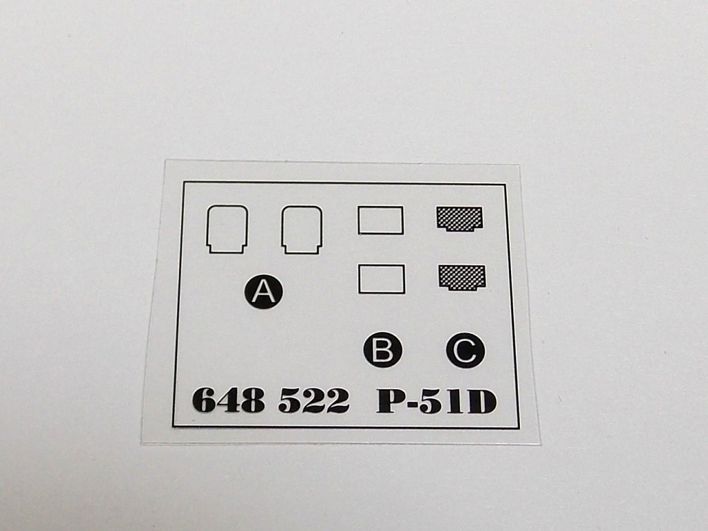 Ďalej je to brassinová "základňa", na ktorej su odliatky troch zameriavačov. Použijeme typ podľa zvolenej verzie "Mustang-a". Ďalej je to malá planžietka s dvoma leptanými dielmi a na záver aršík obtiskov. Ešte teda aby som nezabudol je tam pribalený malý film presklenia na zameriavač.
