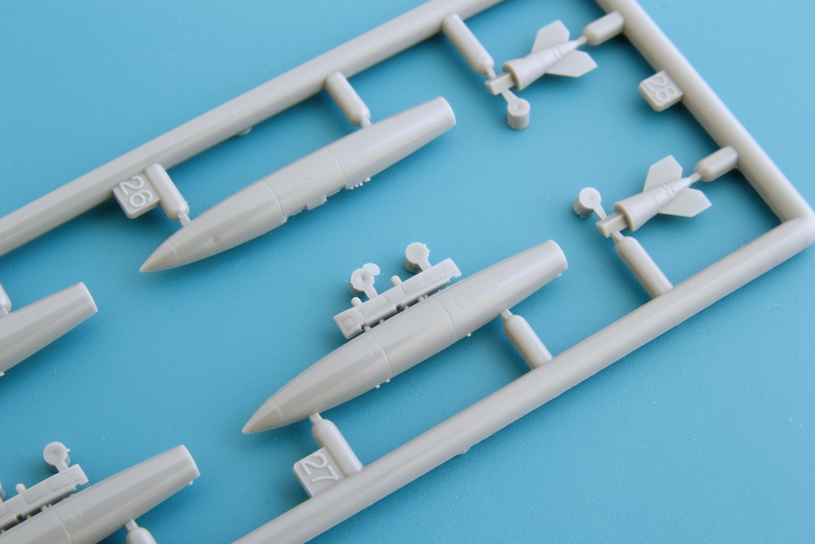 Rámečky s plastovými díly nalezneme v sáčku tři. Jeden velký rámeček s téměř všemi díly, jeden malý rámeček s díly směrovky a jeden rámeček s čirými díly. Plastové díly jsou velmi pěkně zpracovány. Rytí se je velmi jemné a bude potřeba opatrnost při stavbě. Díly mají velmi pěkný povrch. Dělící roviny formy je téměř neznatelná, ale bohužel jsou na pár dílech propadliny. Při prvním pohledu to vypadá na stavebnici, která se bude stavět pěkně. Ale to se pozná až se pustím do stavby.