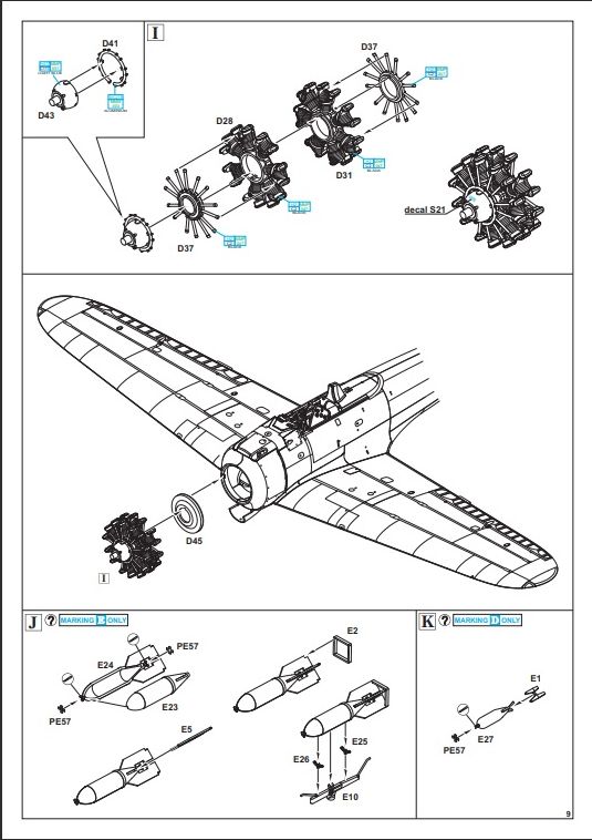 V posledním rámečku z šedého plastu máme podvozkové nohy, kolečka hlavního podvozku, kryty podvozkových šachet, vrtuli, závěsníky na bomby, bomby (dva druhy) a v neposlední řadě i přídavnou nádrž. Vše je taktéž ve vysoké kvalitě bez kazů a propadlin.