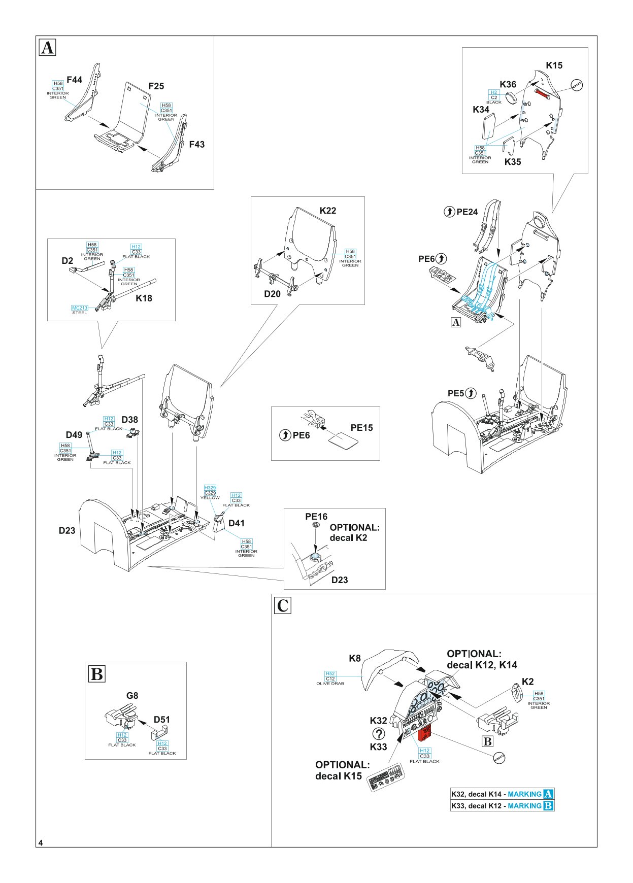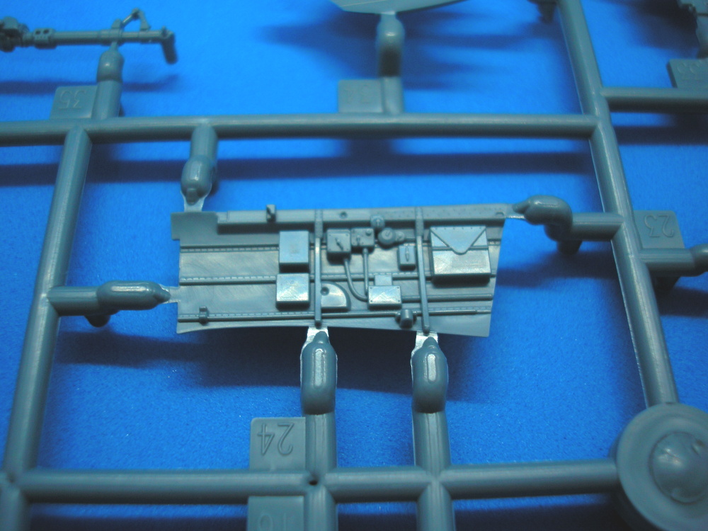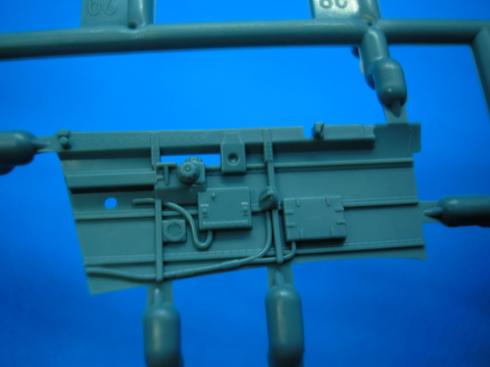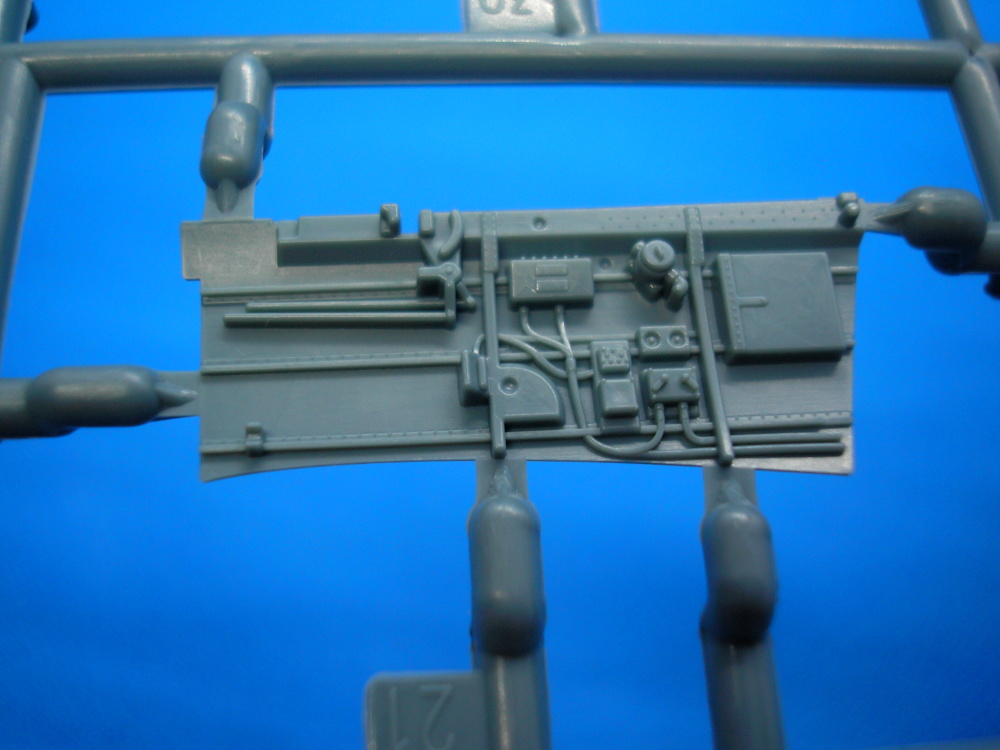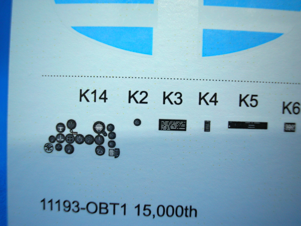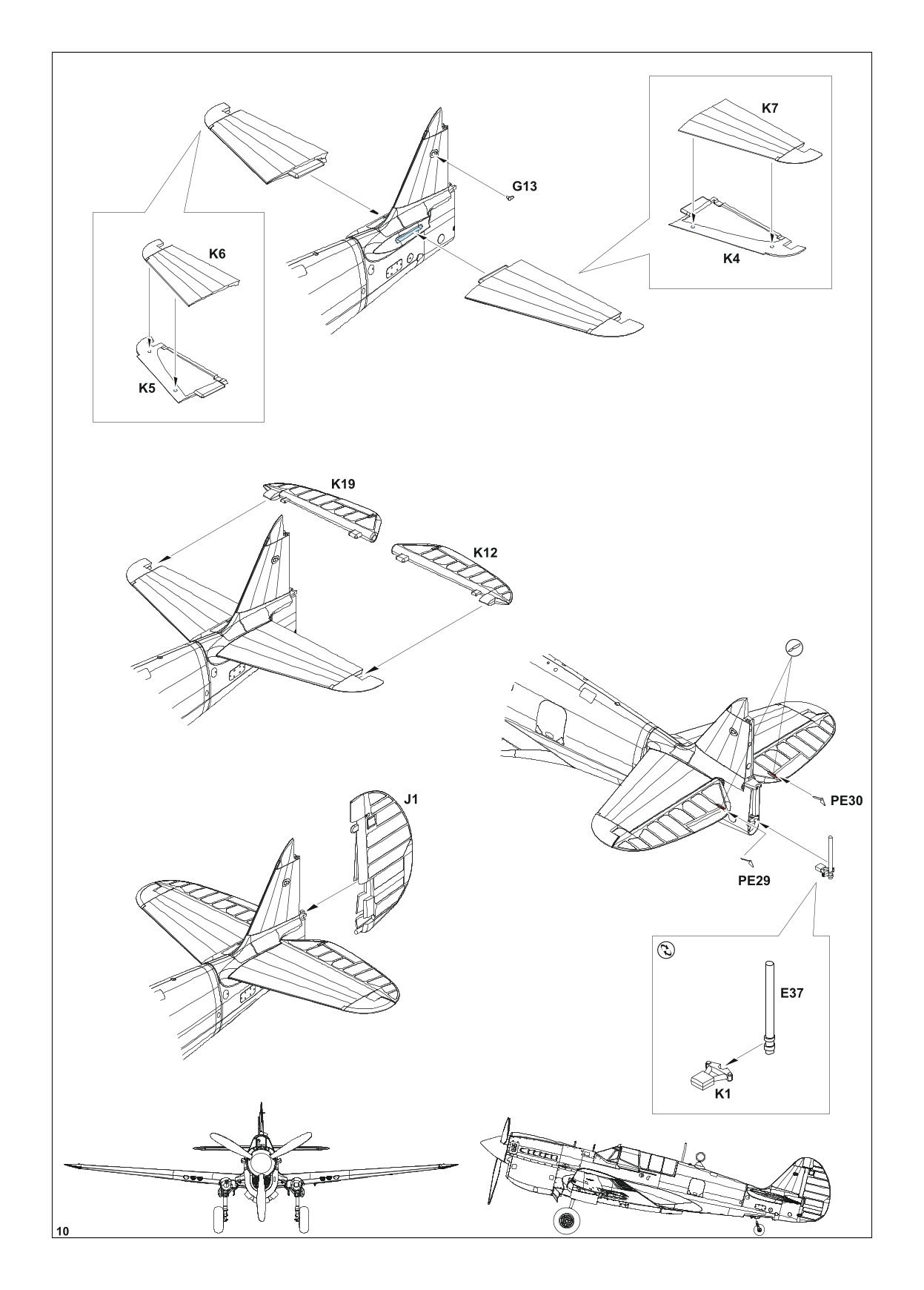 Rámeček K. Tento rámeček obsahuje díly stabilizátorů, výšková kormidla, palubní desky jak pro použití přístrojů z obtisku, tak pro použití dílů z leptané sady. Dále pancéřovou desku za sedačku pilota, opěrku hlavy, boční stěny pilotního prostoru, páku řízení a další drobné ovládací prvky do pilotního prostoru.