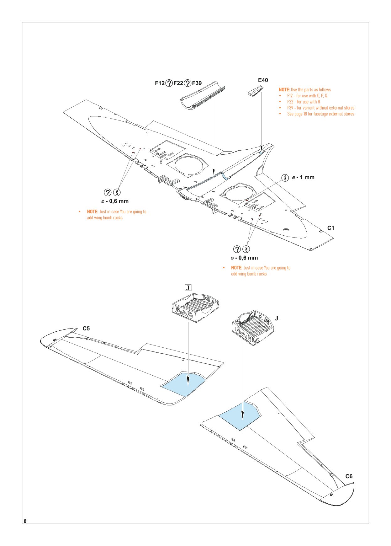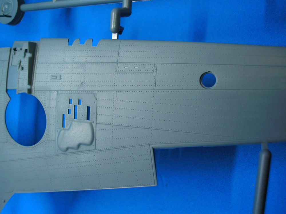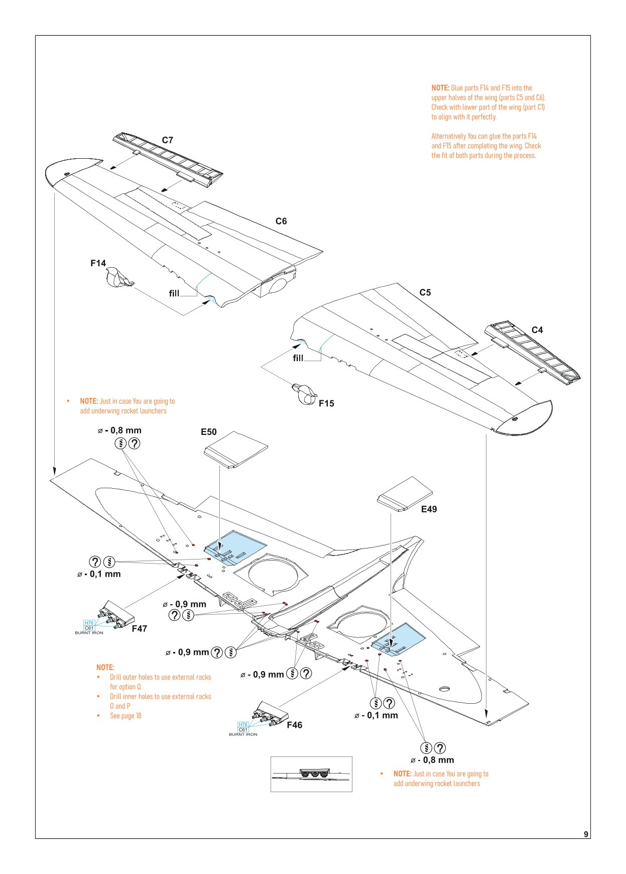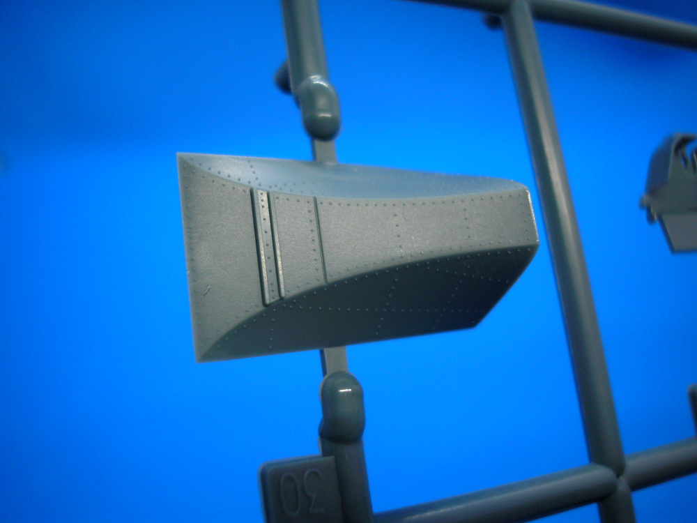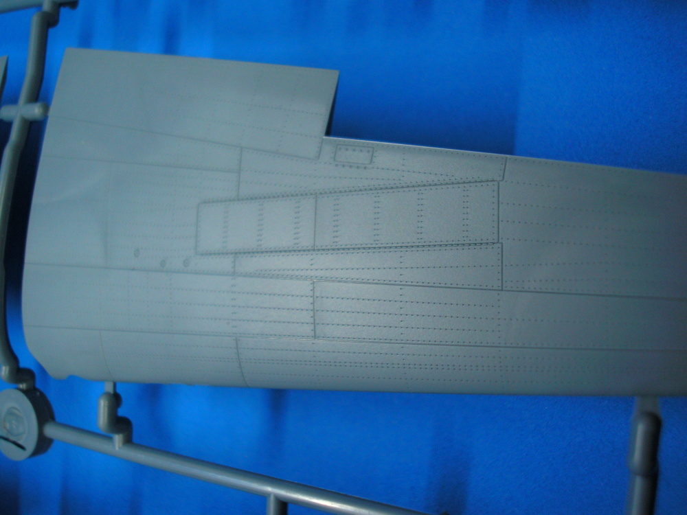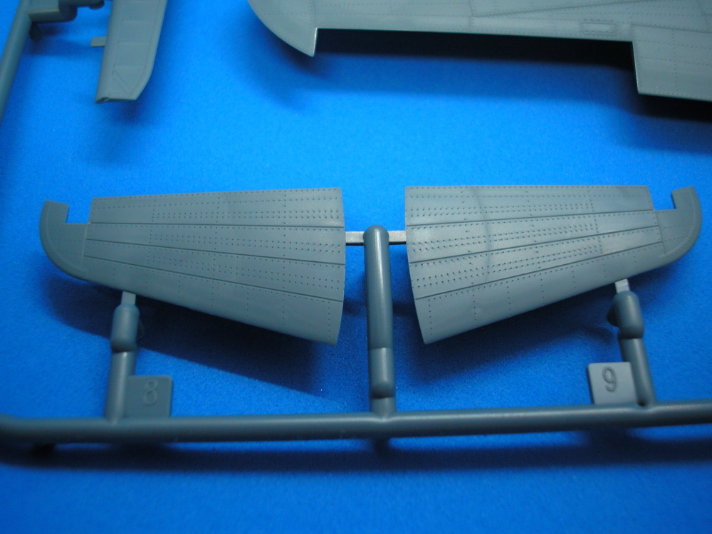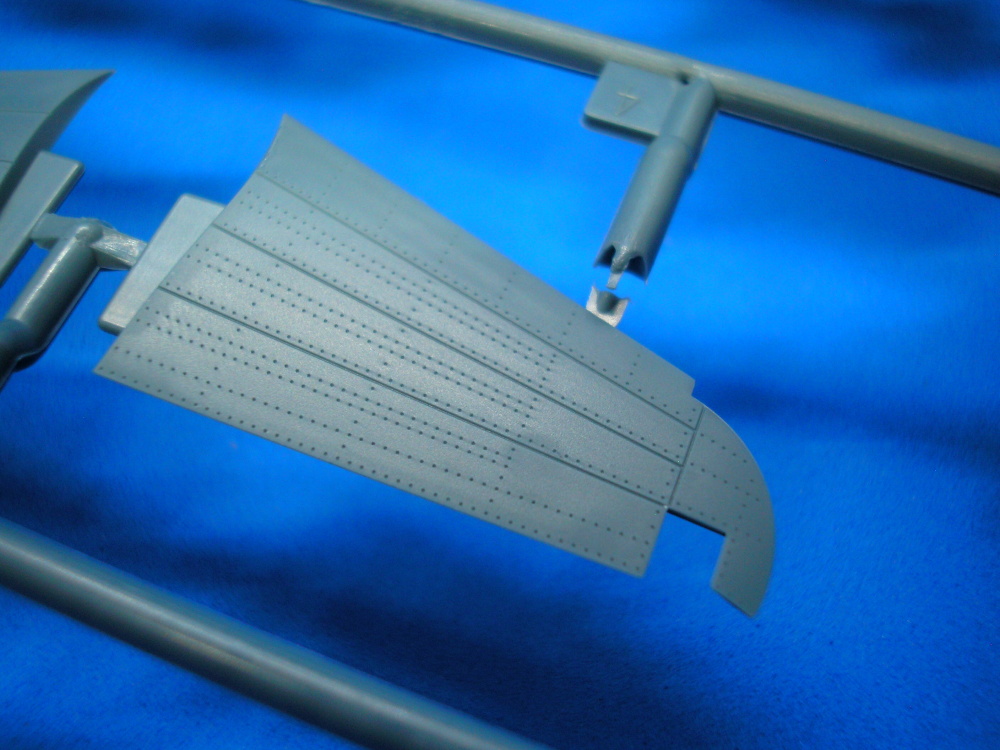 Rámeček C nese díly křídla, křidélka, stabilizátory a výšková kormidla. Všechny díly jsou opatřeny negativním rytím paneláže a nýtováním. Při procházení facebooku jsem narazil na upozornění k této stavebnici, kdy na straně 9 stavebního návodu je uveden průměr vrtáku pro odvrtání otvoru pro pumové závěsníky 0,1 mm. Na tyto otvory máme použít vrták průměru 1 mm.