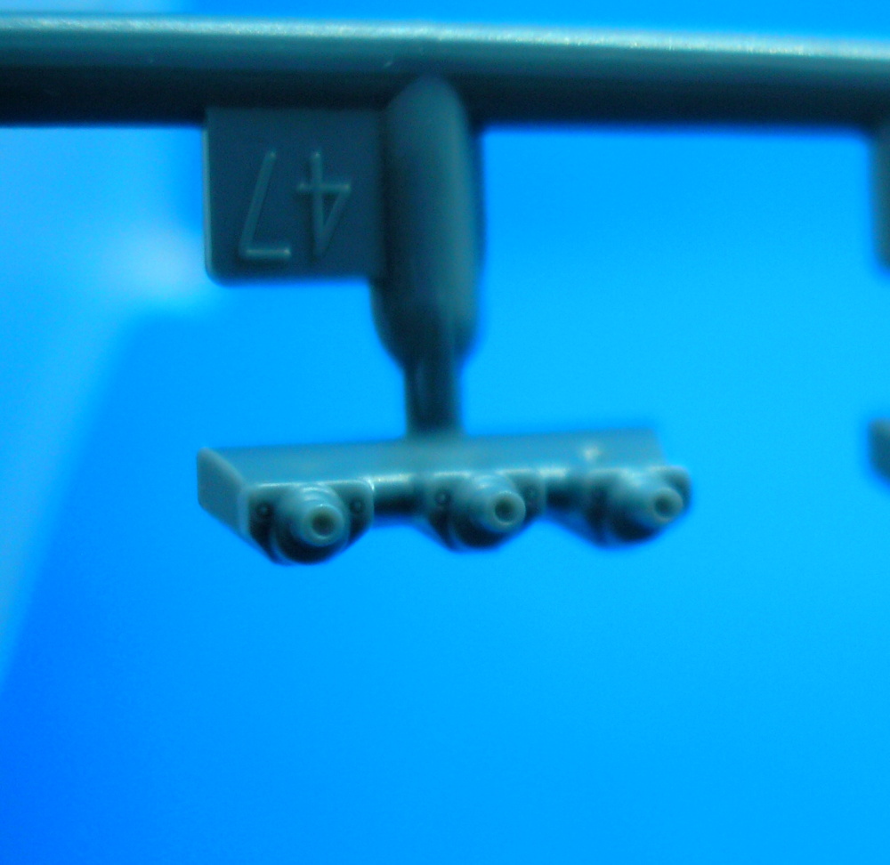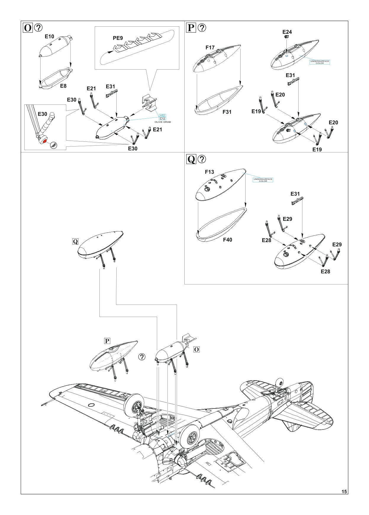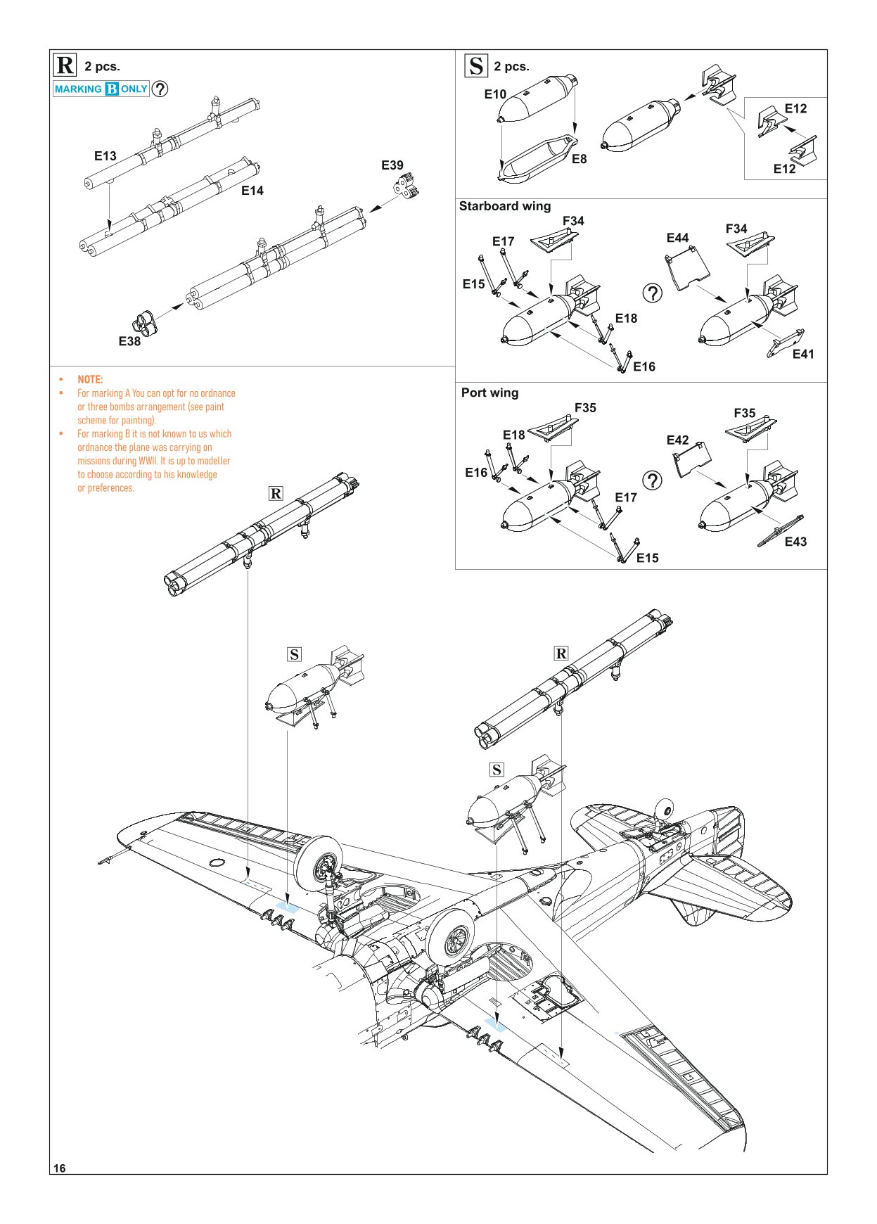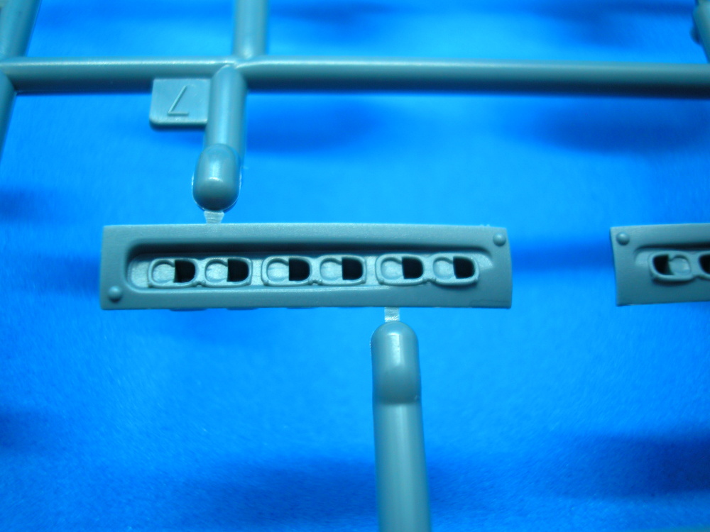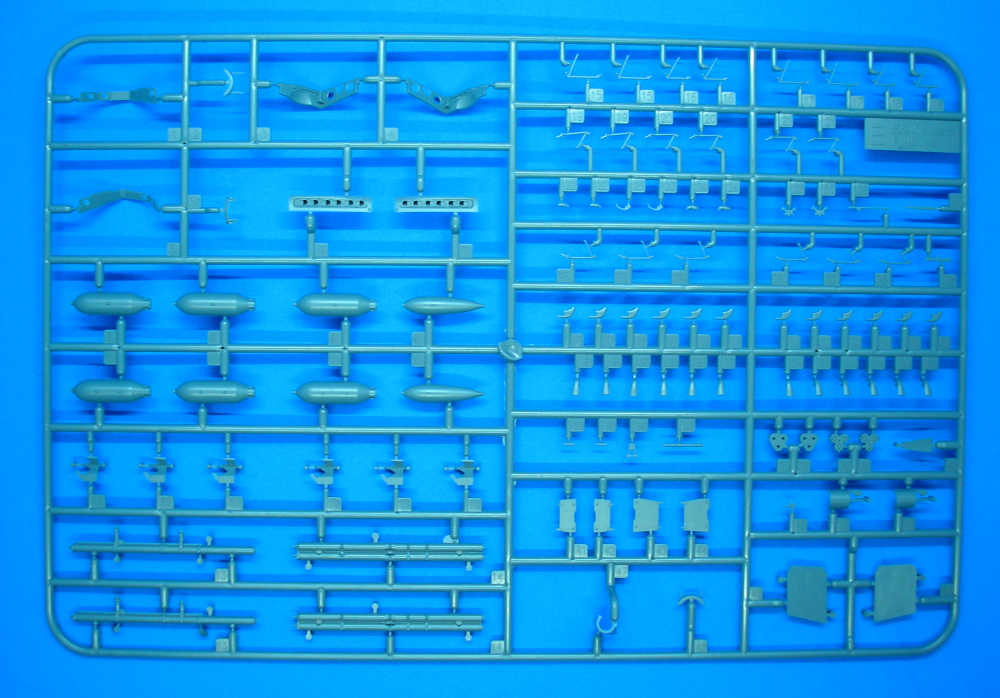 V rámečku E jsou umístěny díly, jako jsou stěny podvozkových šachet, výfuky, lišty pro osazení výfuků, pitotova trubice, díly spodní části křídla s otvory pro vypadávání nábojnic a článků nábojového pásu, díly trojnásobného odpalovače typu Bazooka, pumové závěsníky, těla 500 lb pum a jejich stabilizátory,