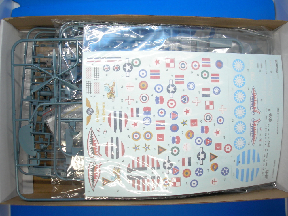 Je balena do charakteristické krabice s horním otevíráním. Ke koupi nás láká atraktivní kresbou patnácti tisíctého vyrobeného stroje P-40. Po jejím otevření v ní nalezneme šest rámečků ze světle šedého plastu s cca. 266 díly a jeden rámeček z čirého plastu s 27 díly. Dále v krabici nalezneme stříkací masky z kabuki pásky, planžetu s lepty, stavební návod a aršík s obtisky.